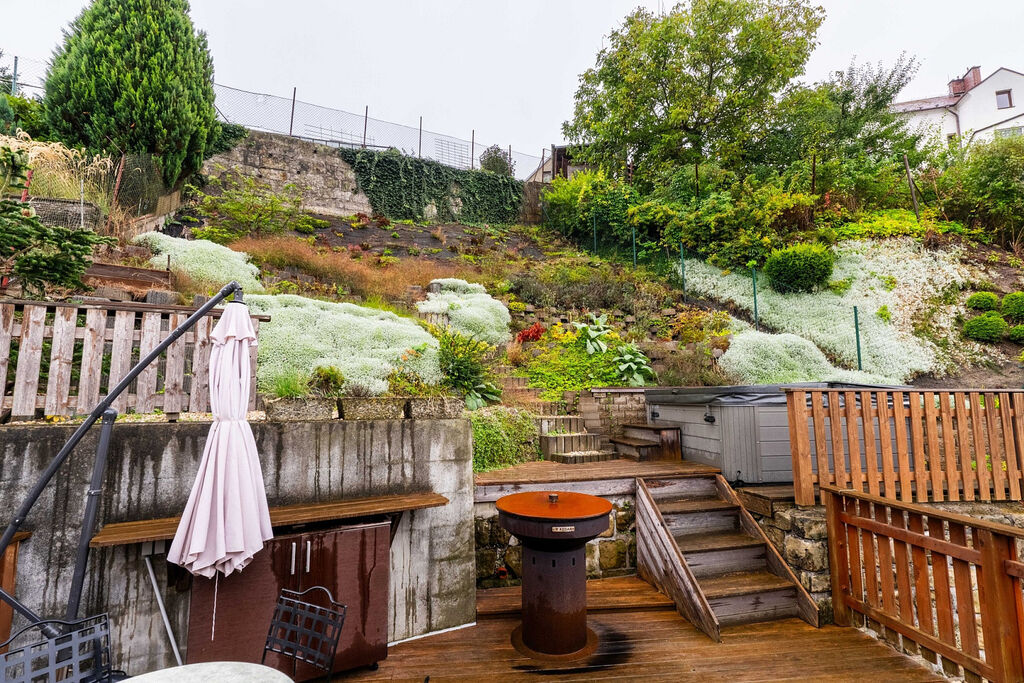 Součástí domu jsou dvě prostorné garáže o celkové ploše 44 m², které poskytují komfortní parkování i dostatek úložného prostoru. K odpočinku a relaxaci poslouží terasa cca 20 m² vybavená vířivkou s průtokovým solárním kolektorem.