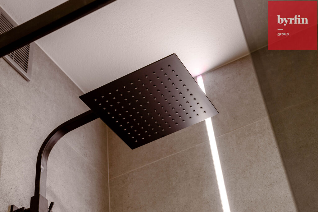 Kuchyňská linka je kompletně vybavena spotřebiči Gorenje (lednice, myčka, trouba, indukce) a perfektně ladí se zbytkem bytu. Koupelna nabízí prostorný sprchový kout, přičemž WC je řešeno samostatně — praktické a pohodlné.