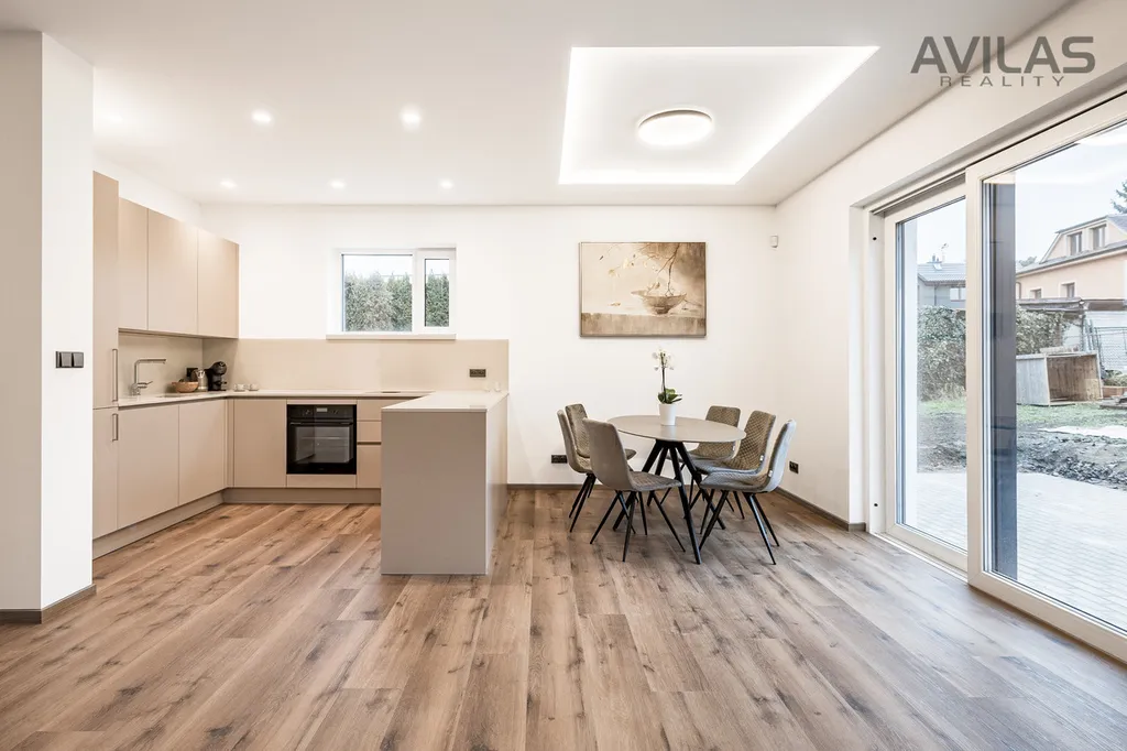 Po vstupu do zádveří můžete vstoupit do šatny, dále z chodby technické místnosti, koupelny se sprchovým koutem a wc nebo do srdce domu v podobě prostorného obývacího pokoje s kuchyňským koutem. Pro vzdušnost a světlost prostoru navrhl architekt francouzské okno se vstupem do zahrady, které přírodním světlem osvětluje obývací pokoj. V 1.NP se dále nachází garáž s průchodem do domu. Ve 2.NP se nachází čtyři pokoje a koupelna s wc.