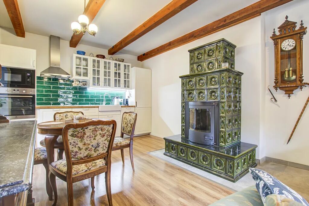 Dům na třech podlažích nabízí útulný interiér s důrazem na detaily, dřevěné podlahy, kvalitní keramiku a prvky zachovávající dobový charakter.