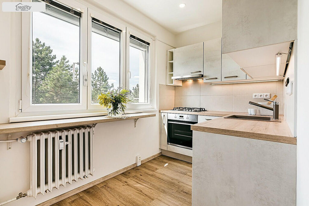 Vybavení : kuchyňská linka včetně spotřebičů ( plynová varná deska, elektrická trouba, digestoř), odkládací stěna, nové dveře a zárubně, venkovní žaluzie.