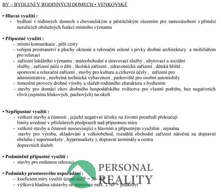 Dle platného územního plánu je pozemek určen k zástavbě rodinným domem v ploše BV – Bydlení v rodinných domech venkovského charakteru. Hlavní využití je přesně popsáno jako bydlení v rodinných domech s chovatelským a pěstitelským zázemím pro samozásobení s příměsí nerušících obslužných funkcí místního významu. Podmínky prostorového uspořádání jsou dány koeficientem míry využití území (KZP) 30–40 a výškovou hladinou zástavby stanovenou na maximálně 2 NP + podkroví.