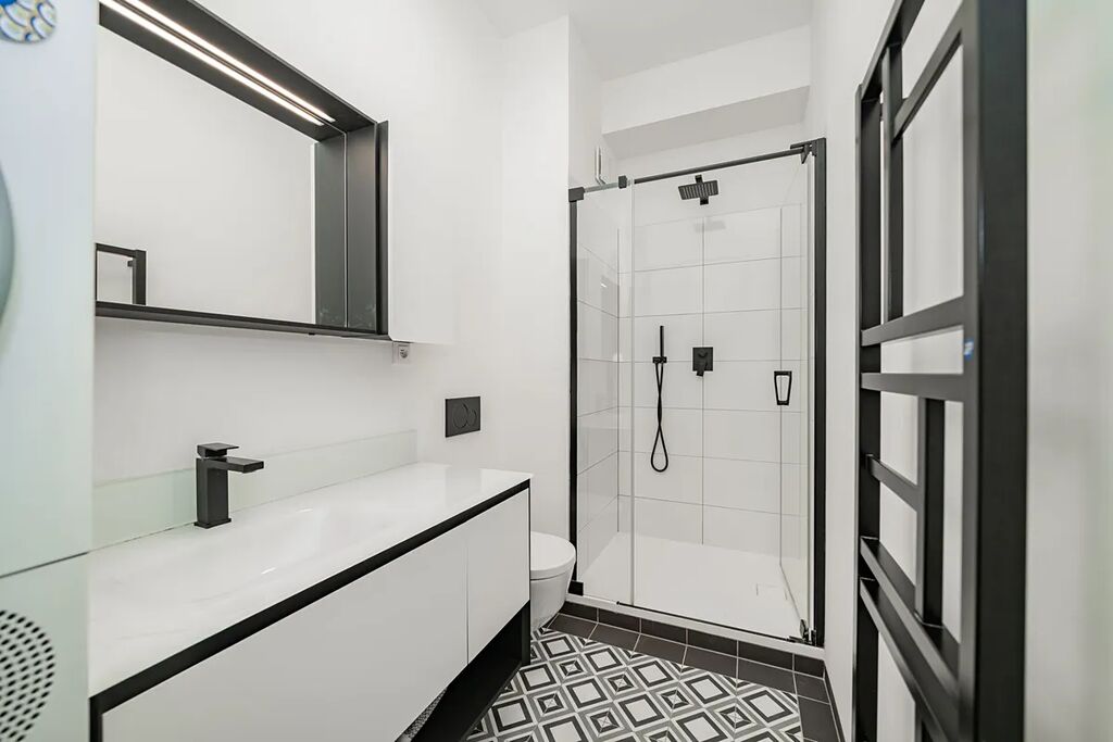 Byt s velkorysou výškou stropu - 3 metry, je umístěný ve druhém patře a je vybavený značkovými zařizovacími předměty s důmyslným uspořádáním poskytujícím dostatek úložných prostor.