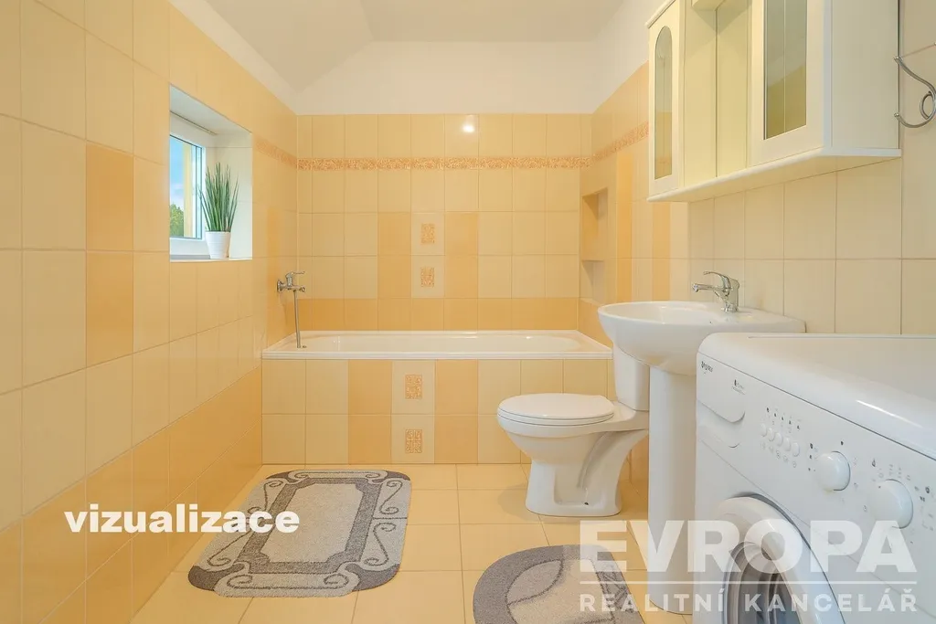 V přízemí je také koupelna s vanou a WC, menší úzká místnost využitelná jako zadní kuchyňka, komora (špajz) a dílna, do které je přístup právě přes zadní kuchyni. Díky členitému půdorysu lze místnosti jednoduše přizpůsobit vlastním potřebám.