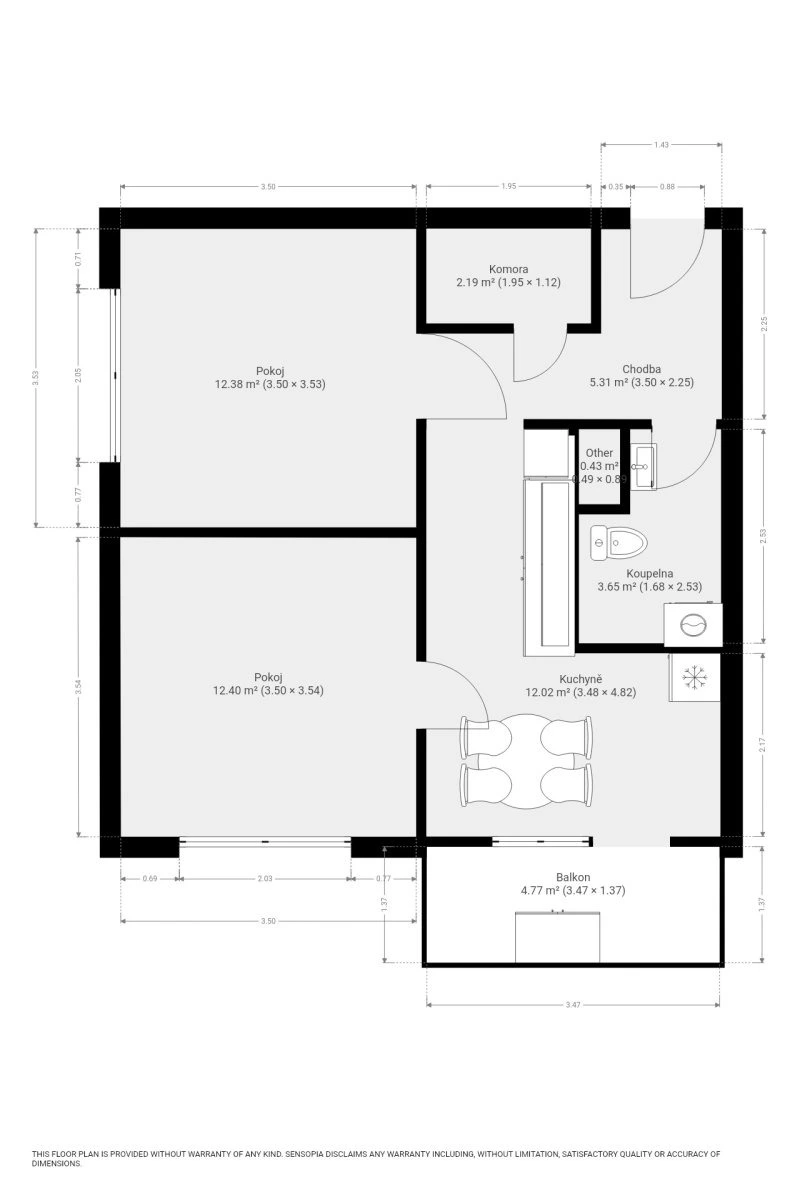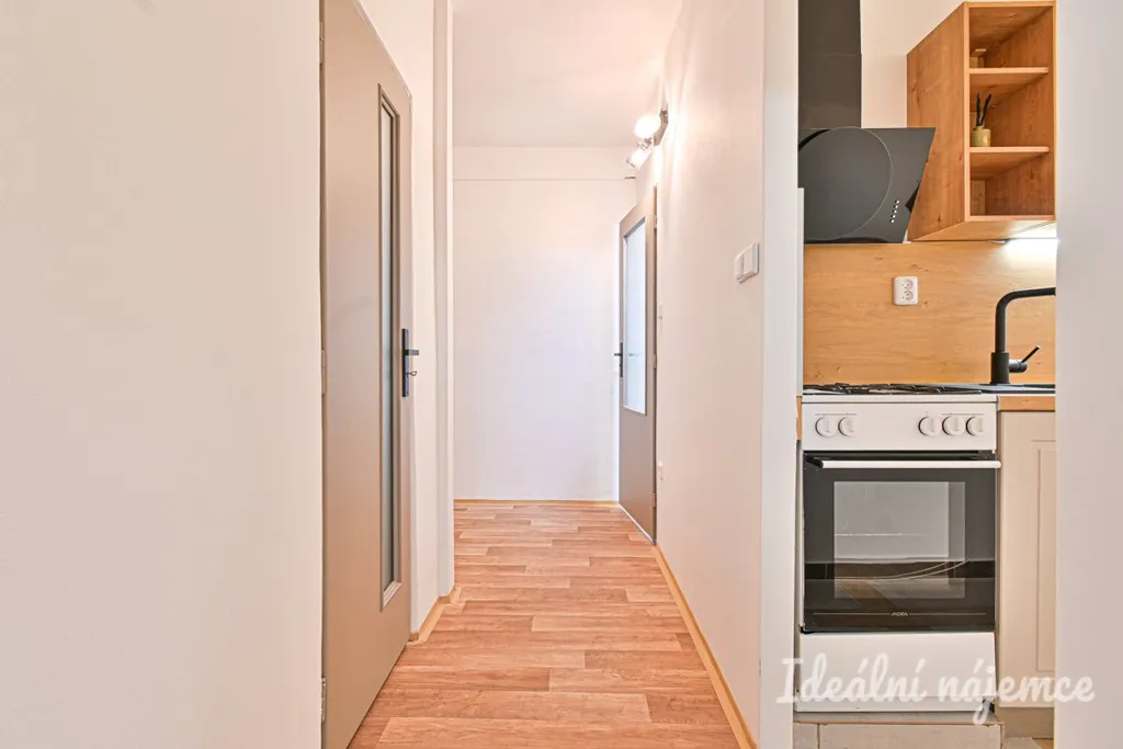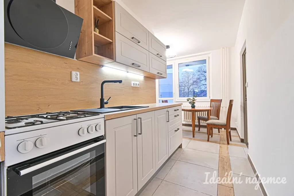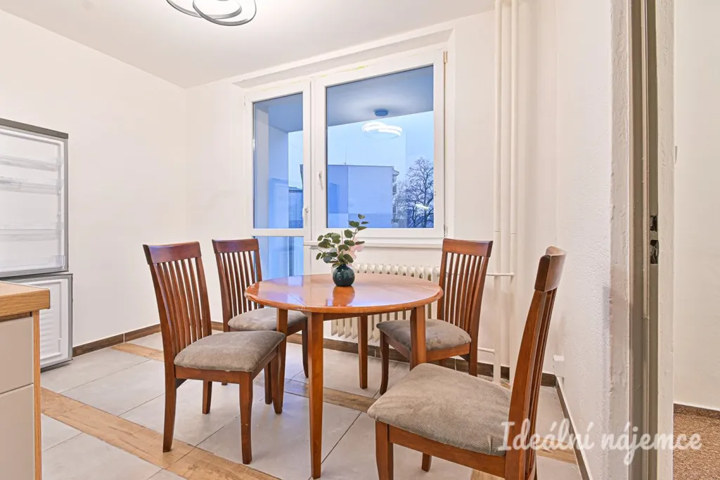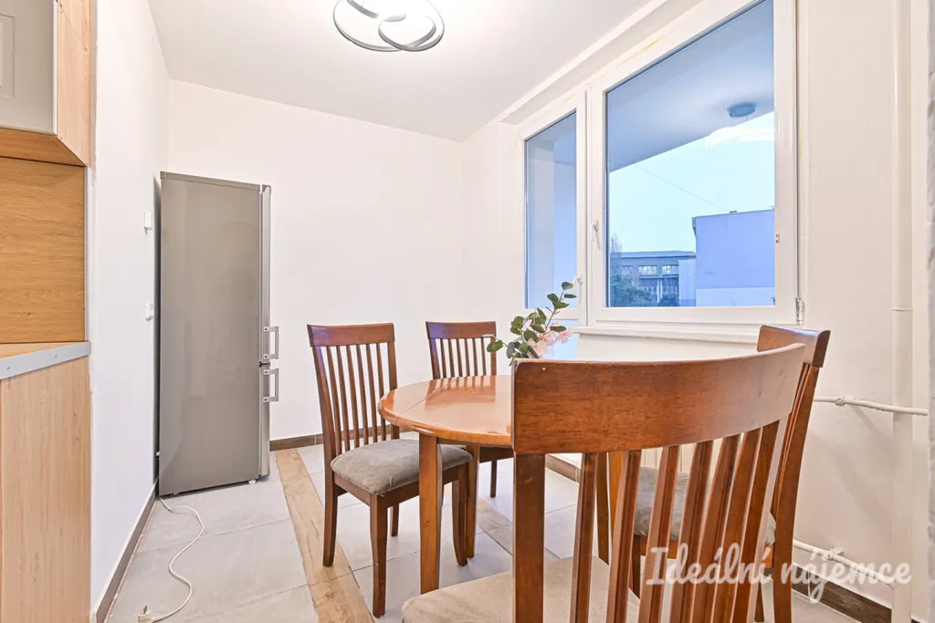 Jedná se o částečně zařízený byt. Vybavení zahrnuje kuchyňskou linku s plynovým sporákem, troubou, digestoří, lednicí a jídelním stolkem se židlemi.