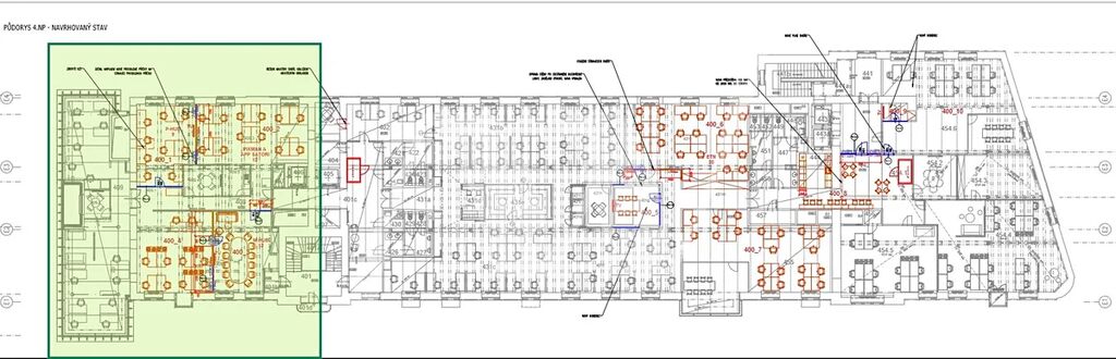 • dispozice zahrnuje 4 velké kanceláře (každá pro až 10 osob), další velkou kancelář, prostornou zasedačku pro 12-16 osob, 2 zasedačky (pro 4 osoby), kuchyňku vybavenou spotřebiči