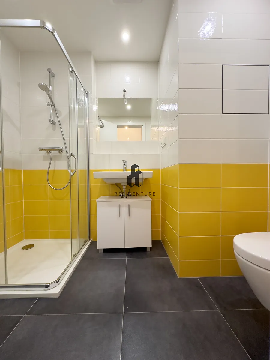 Koupelna je vybavena sprchovým koutem a toaletou, nechybí ani pračka.