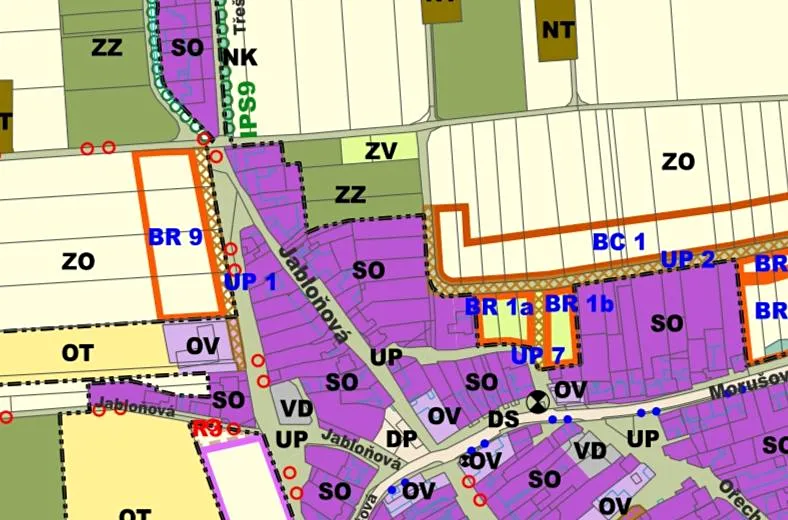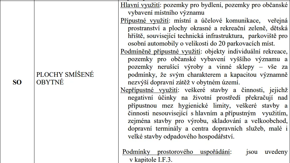 Hlavní využití: pozemky pro bydlení, pozemky pro občanské vybavení místního významu Přípustné využití: místní a účelové komunikace, veřejná prostranství a plochy okrasné a rekreační zeleně, dětská hřiště, související technická infrastruktura, parkoviště pro osobní automobily o velikosti do 20 parkovacích míst.