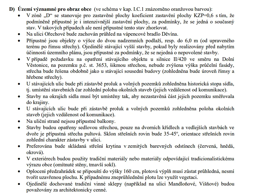 Podmíněně přípustné využití: objekty individuální rekreace, pozemky pro občanské vybavení vyššího významu a pozemky nerušící výroby a vinné sklepy vše za podmínky, že svým charakterem a kapacitou významně nezvýší dopravní zátěž v obytném území.
