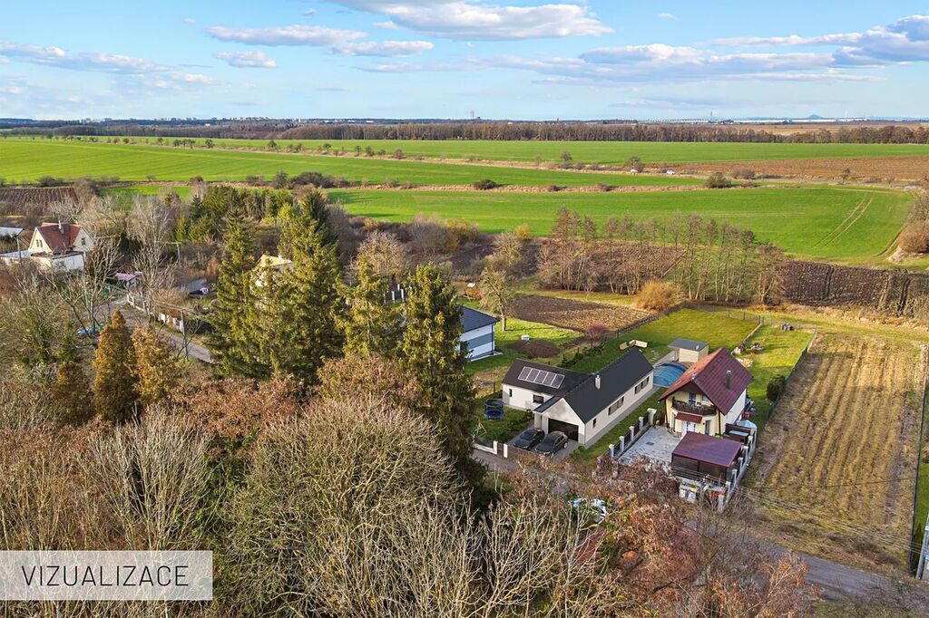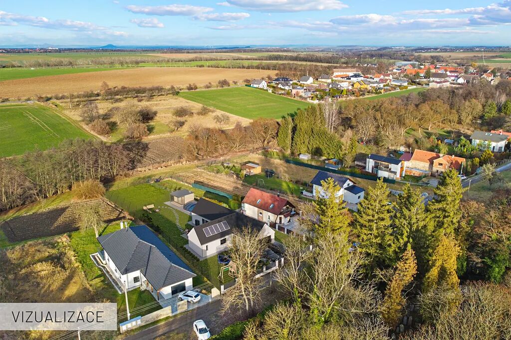 Na pozemek je vypracována studie rodinného přízemního domu 6+kk s dvojgaráží o zastavěné ploše 277 m2, na základě které byly vyhotoveny vizualizace v inzerátu.
