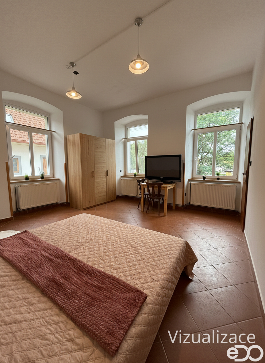 Dispozice zahrnuje 2 pokoje, kuchyň propojenou se společenským sálem (aktuálně využívaným jako jídelna), koupelnu a samostatné WC. Jednotka je vhodná pro firemní ubytování (např. pro dělníky či zaměstnance), ale může dobře posloužit i jako nenáročné bydlení pro rodinu nebo pár, případně spolubydlení.