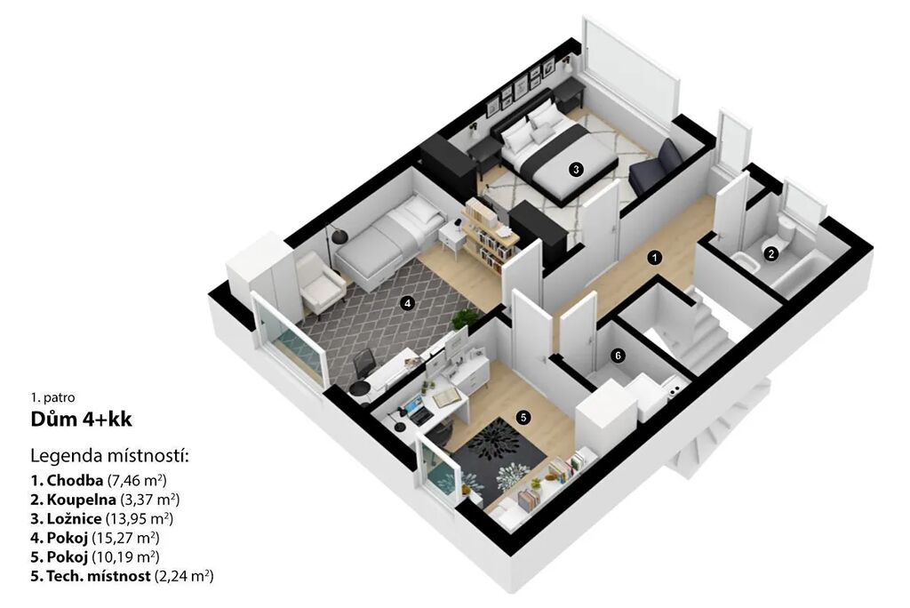 Dům je rozložen do dvou podlaží s podlahovou plochou 110 m². Obytná plocha 91 m² je rozdělena do dispozice 4+kk, která zahrnuje čtyři pokoje a kuchyňský kout. Jižně orientovaná terasa o rozloze 16 m² zajišťuje dostatek světla po celý den. K domu patří zahrada o rozloze 88 m², ideální pro relaxaci a venkovní aktivity, a garáž o velikosti 19 m² s dvěma dalšími parkovacími místy před domem.