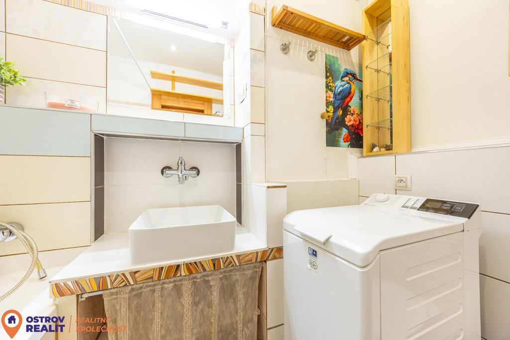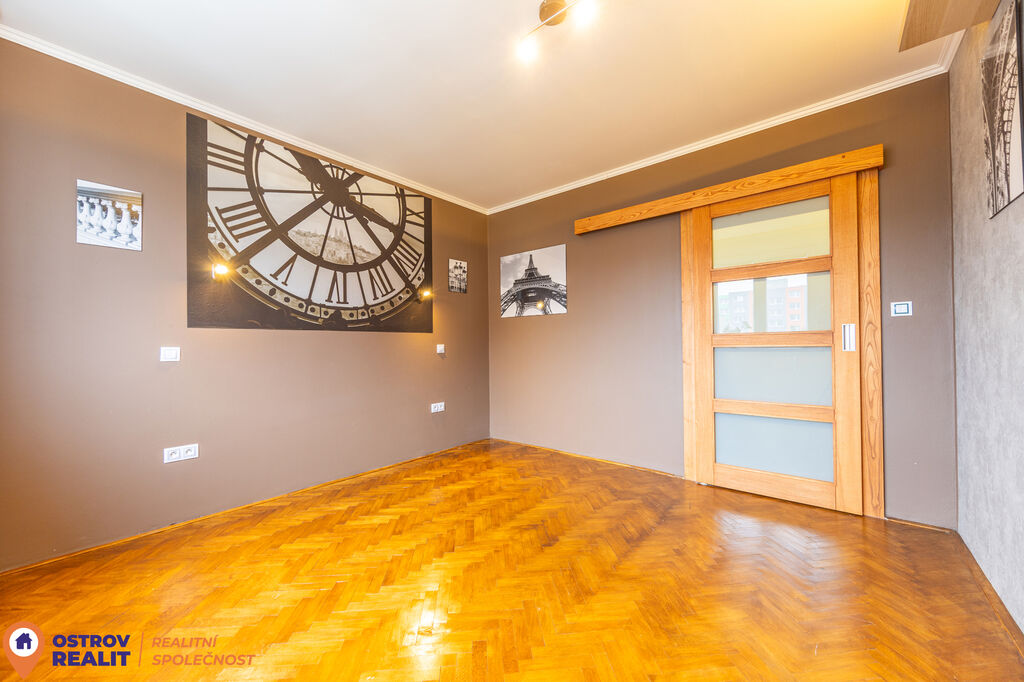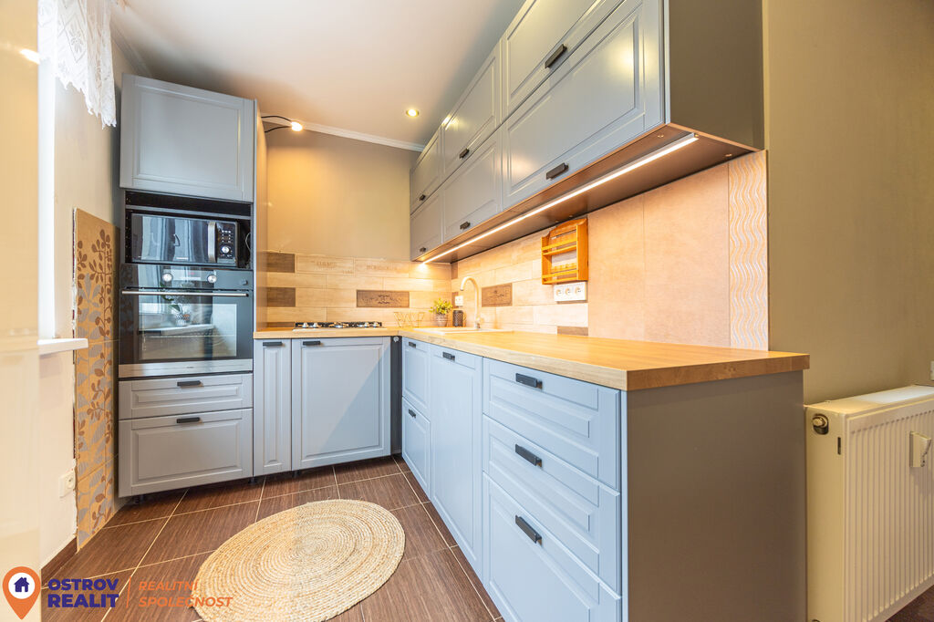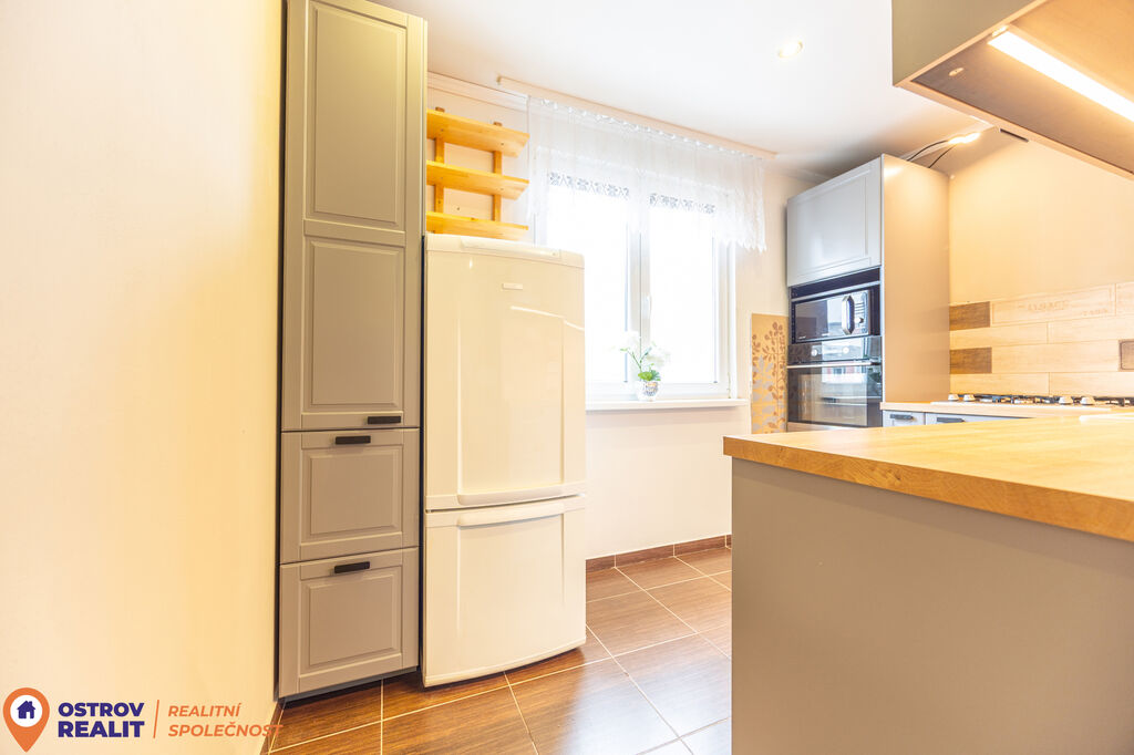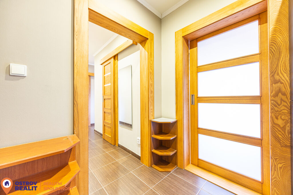 Velkým benefitem bytu jsou zcela nové posuvné dveře z masivu, které skvěle doplňují interiér a dodávají mu nadčasový vzhled. Kuchyň je vybavena novou kuchyňskou linkou, a tak je připravena k okamžitému užívání bez dalších investic.