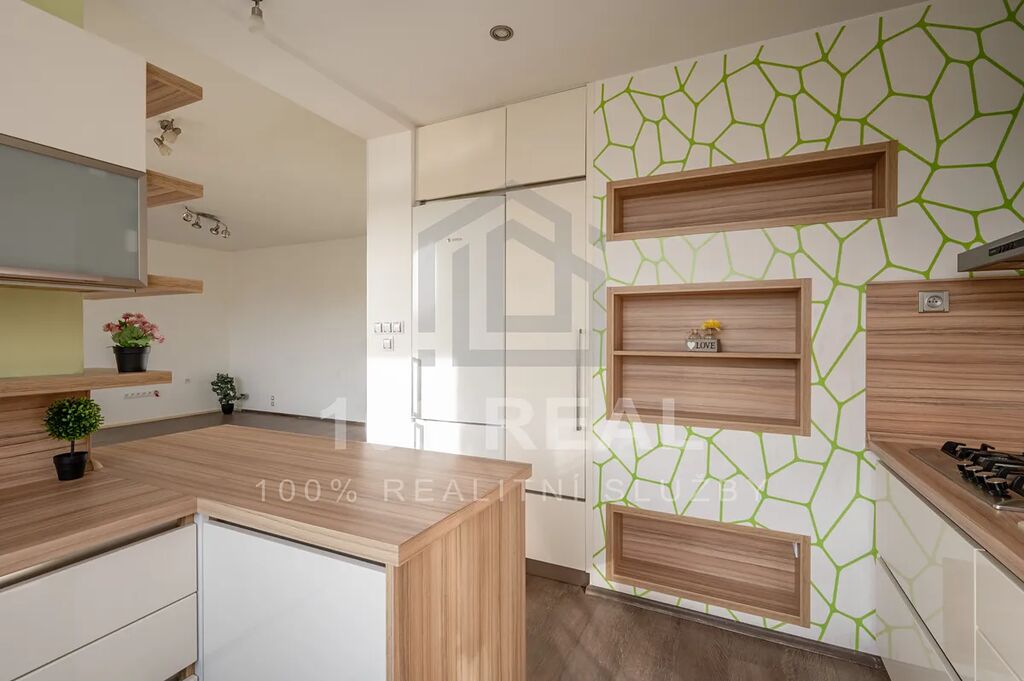 - kuchyň s moderní kuchyňskou linkou se zabudovanými spotřebiči (lednice s mrazákem, myčka, plyn. sporák, el. trouba a mikrovlnka) a obývacím pokojem (33,2 m²)