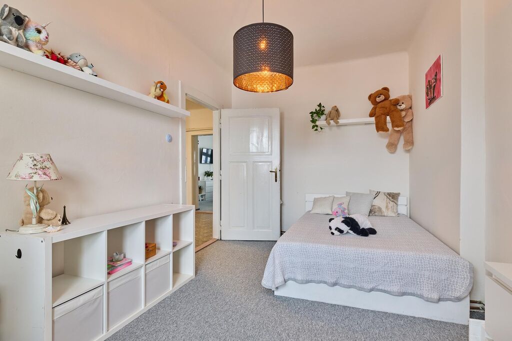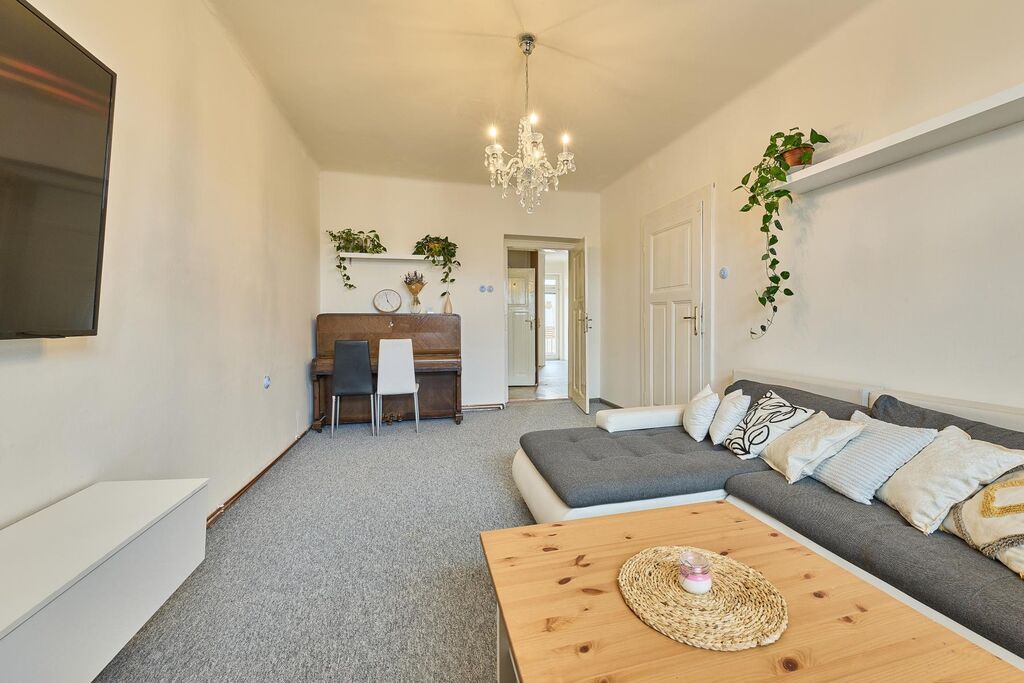 Dispozice bytu: velmi prostorná předsíň se vstupem na lodžii, obývací pokoj, kuchyně s kuchyňskou linkou se spotřebiči, ložnice, dětský pokoj, koupelna s vanou, samostatná místnost WC, spíž. K bytu náleží velký sklep umístěný v suterénu domu. Byt je aktuálně s novými podlahovými krytinami (lino, koberce) a zcela novým plynovým kotlem, který zajišťuje vytápění a ohřev teplé vody.