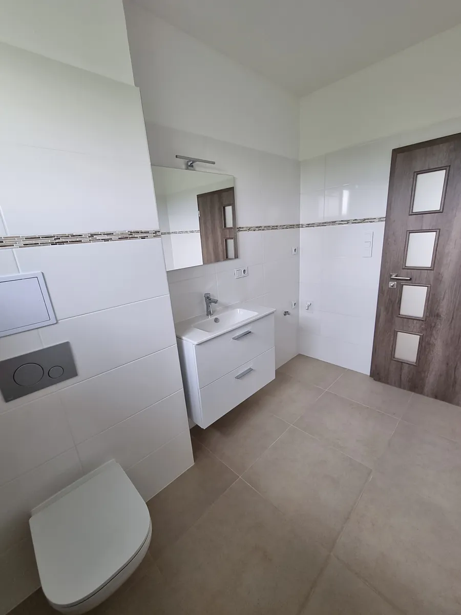 Dispozice přízemí domu je tvořena vstupní předsíní, koupelnou, dvěma samostatnými pokoji a dále prostorným obývacím pokojem s kuchyňským koutem. Z obývacího pokoje je možné vstoupit na terasu francouzským oknem. V patře domu se nachází dvě velmi prostorné ložnice, samostatné WC, technická místnost a koupelna prosvětlená střešním oknem.