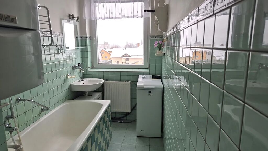 Byt má vlastní plynový kotel, plastová okna, podlahy jsou kombinaci parket a dlažby.