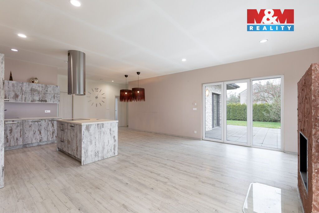 Dominantou interiéru je velký, světlý prostor obývacího pokoje s kuchyní, ze kterého je přímý výhled do zahrady. Kuchyň je navíc doplněna o praktickou spíž.