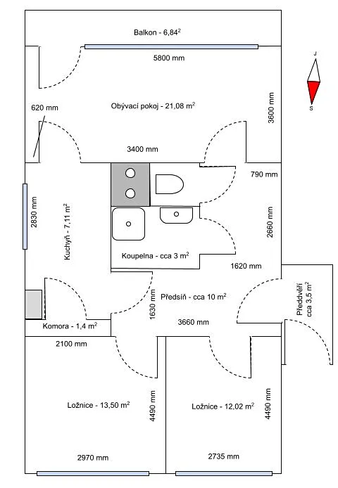 Užitná plocha bytu je 76 m², k tomu je navíc 7 m² lodžie a 2 m² sklepa.