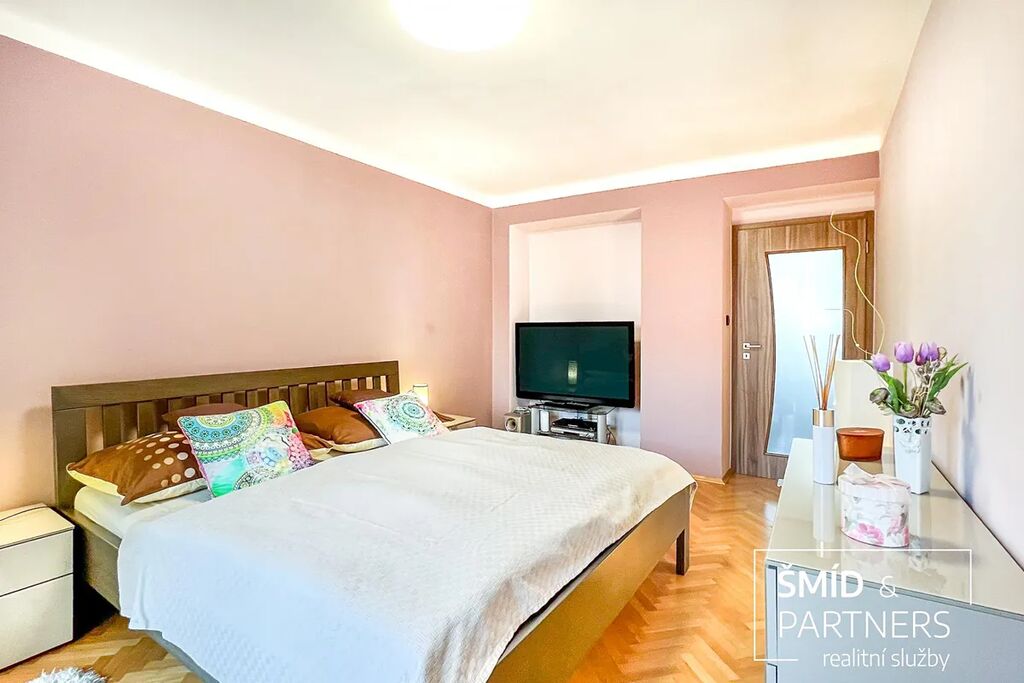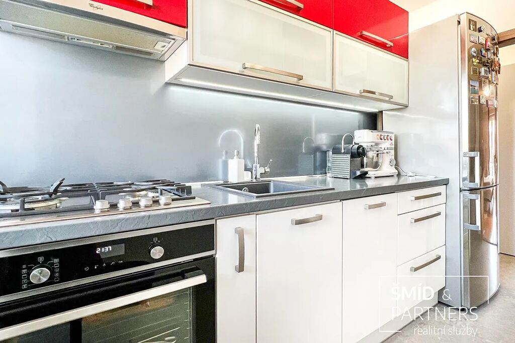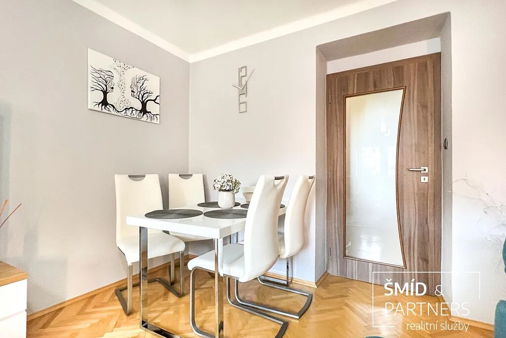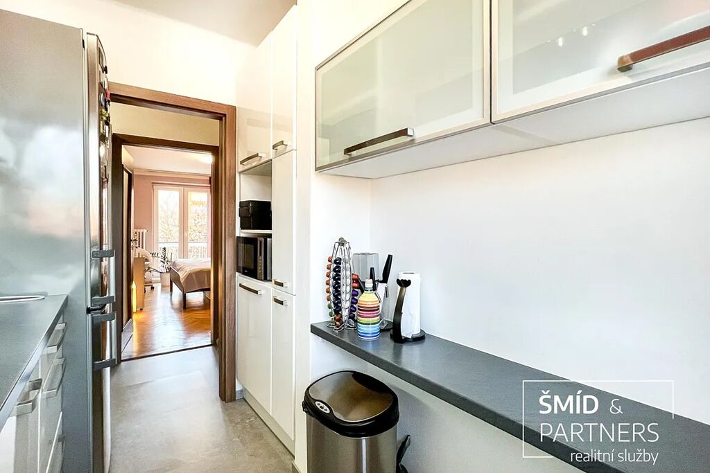 Byt prošel před zhruba deseti lety celkovou rekonstrukcí, která zahrnovala nové rozvody elektřiny, vody i odpadů. Zároveň byly tam, kde to bylo možné, ponechány původní dubové parkety, které dodávají prostoru osobitý charakter a příjemné teplo domova. Moderní kuchyňská linka, dveře i podlahy jsou sladěny do jednotného stylu, a interiér tak působí čistě, útulně a připraveně k okamžitému užívání bez dalších investic.