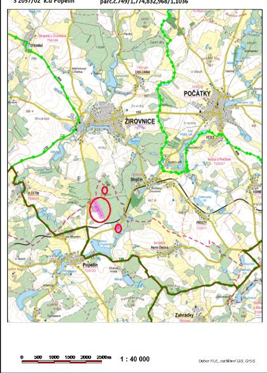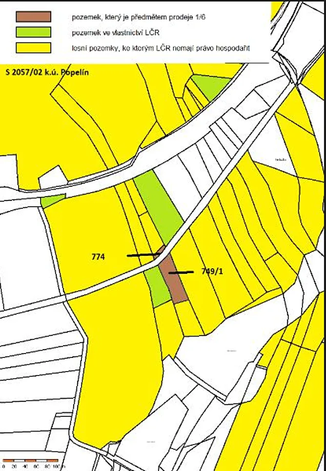 Jedná se o prodej spoluvlastnického podílu o velikosti Id. 1/6 k celku 5 lesních pozemků (p.č. 749/1, 774, 832, 968/1, 1036) menší výměry, pozemky jsou z velké části bez lesního porostu, na malé části výměry se nachází vrby, břízy a několik borovic a smrků. Celková výměra pozemků činí 10176 m2, výměra odpovídající spoluvlastnickému podílu Id. 1/6 z celku 5 pozemků činí 1696 m2.