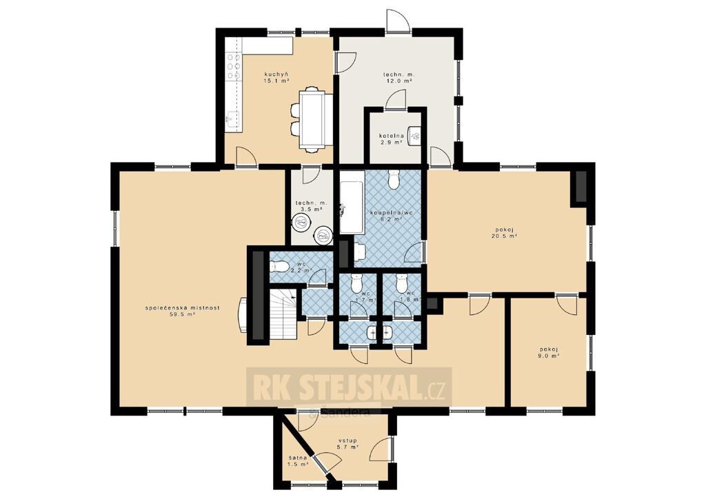 Dispozice:1.NP (přízemí): recepce s posezením a barem a kamny s krbovou vložkou, sociální zázemí pro personál i hosty, prostorná a vybavená kuchyně, technická část - místnost s bojlery a místnost s automatickým kotlem na peletky, který zajišťuje vytápění i ohřev vody, záložním zdrojem je el. kotel, dále v přízemí samostatný vstup a byt či větší apartmán s koupelnou a vanou, vstupní hala se schodištěm do podkroví.