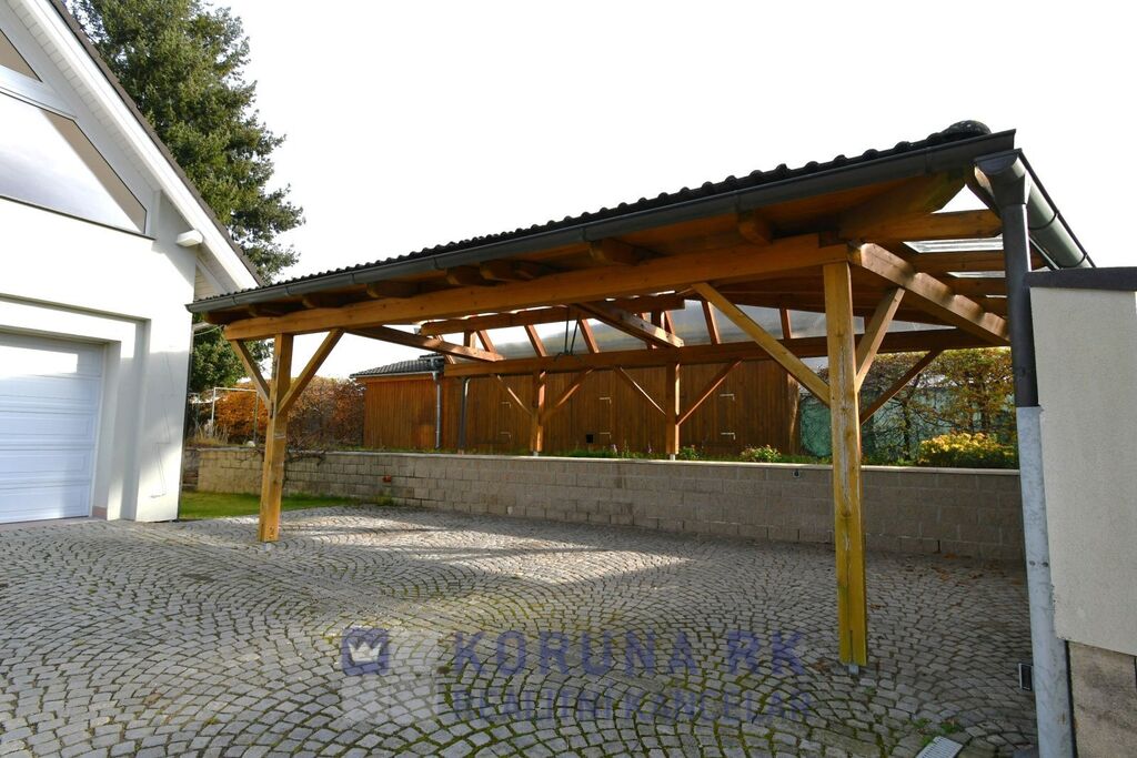V přízemí je prostorná garáž pro 2 OA na kterou navazují technické a skladové prostory, šatna a vstup se schodištěm do ateliéru (garsoniery). Hlavní obytné prostory jsou ve východní části stavby, kdy v přízemí je prostorný obytný pokoj s jídelnou, kuchyní a kachlovými kamny umístěnými přibližně uprostřed tohoto prostoru, dále je v přízemí ložnice, koupelna s WC a hala se schodištěm do podkroví. Z obytného prostoru je možný výstup na terasu. V podkroví jsou z haly přístupné 2 velké pokoje, koupelna s WC, která je průchozí do šatny a též ateliér. U domu se nachází přístřešek na další auto, nebo karavan a dále dřevěná kolna na nářadí a dřevo. Zahrada je s okrasnými keři, v jihovýchodní části zahrady je skleník.