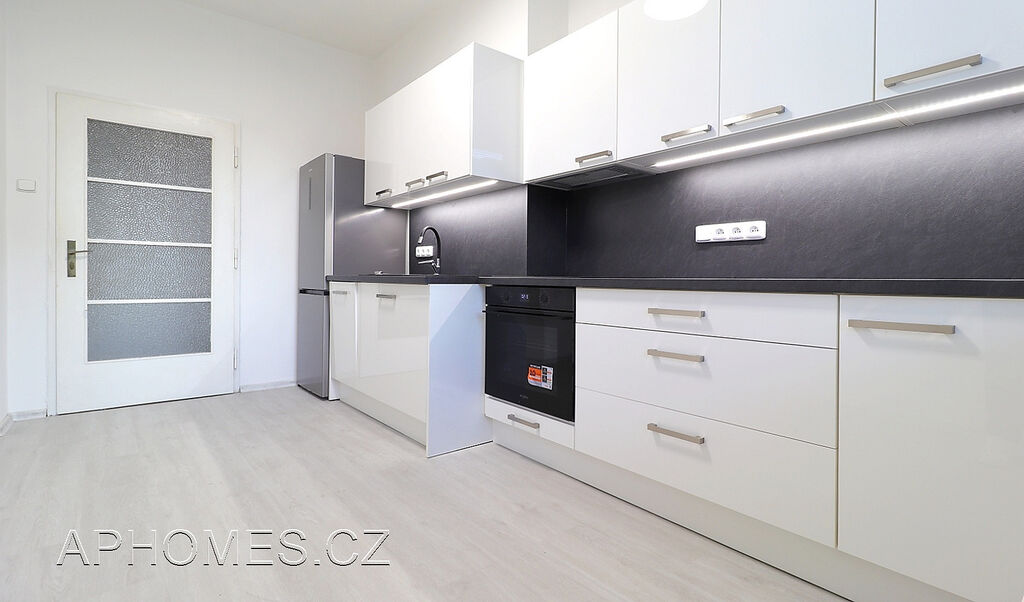 Součástí vybavení bytu je zcela nová moderní kuchyňská linka (vestavěná trouba, digestoř, sklokeramická varná deska, myčka nádobí i lednice.