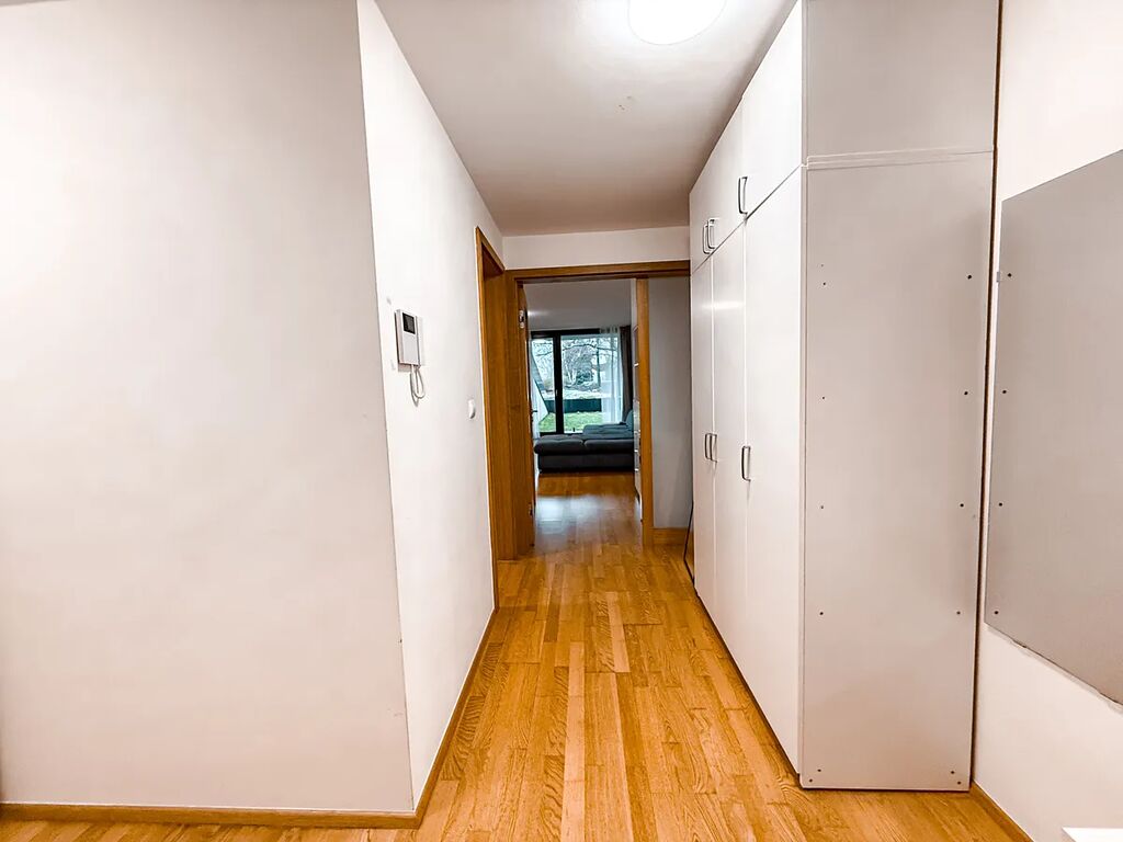 Vstupní chodba nabízí velké množství úložného prostoru díky vestavěným skříním. Hlavní obytná část je příjemně prostorná a kombinuje zónu pro odpočinek, práci i moderní kuchyňský kout.