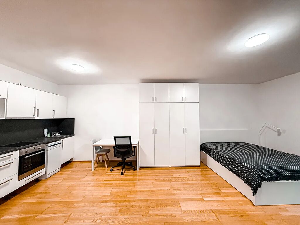 Byt je kompletně zařízen — pohodlná velká postel, prostorná sedačka a pracovní stůl vytváří prostředí, ve kterém se můžete ihned zabydlet.