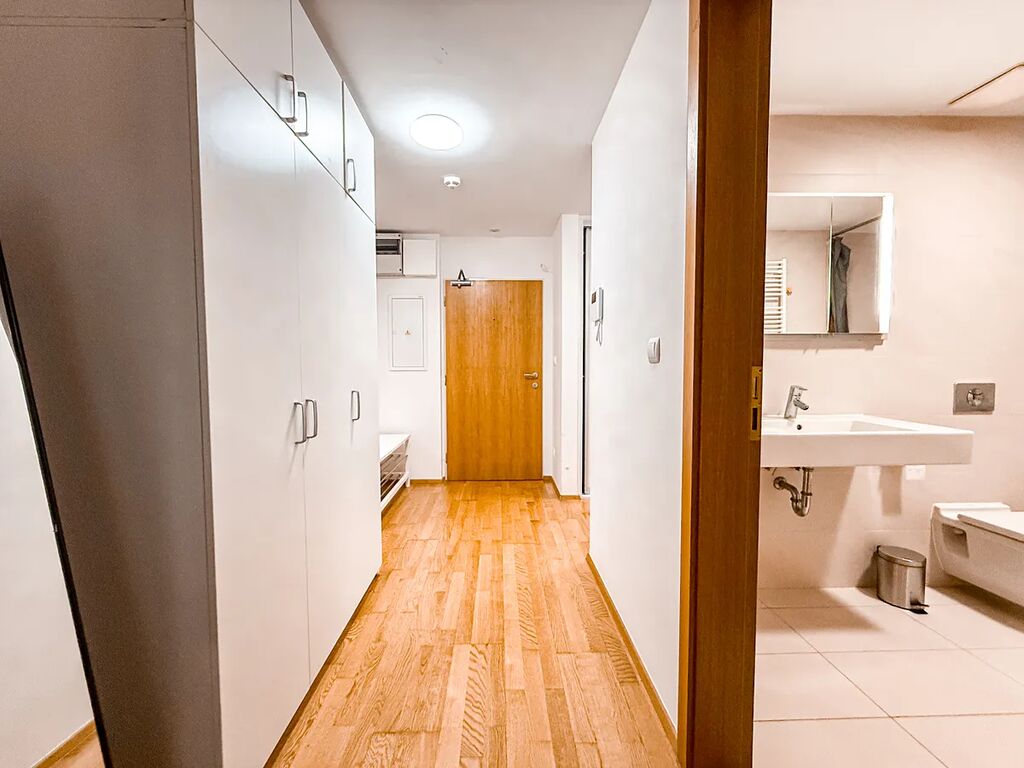 Součástí bytu je také samostatná šatna a technická místnost s pračkou, což výrazně zvyšuje komfort každodenního života — řešení, které není u bytů 1+kk běžné.