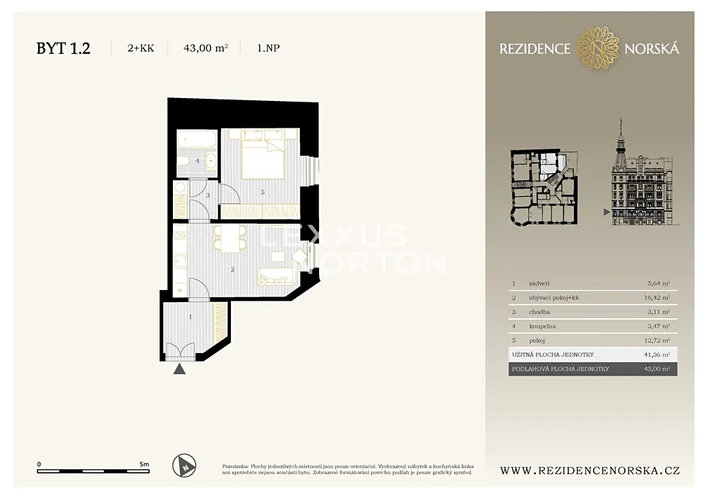 Představujeme prakticky řešený byt 2+kk o podlahové ploše 43 m², který nabízí moderní komfort v elegantním prostředí secesní Rezidence Norská.