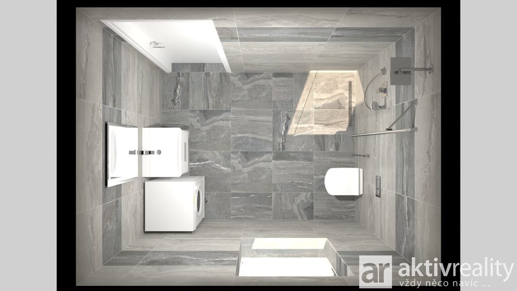 V přízemí se nachází prostorná společenská část domu tvořená obytným prostorem s kuchyňským koutem, odkud je přímý vstup na venkovní terasu. Součástí přízemí je také vstupní chodba, koupelna, technická místnost a krytá garáž se vstupem přímo do interiéru. Tento koncept umožňuje pohodlné každodenní fungování, zejména při nákupech, v nepříznivém počasí nebo při pohybu s dětmi.