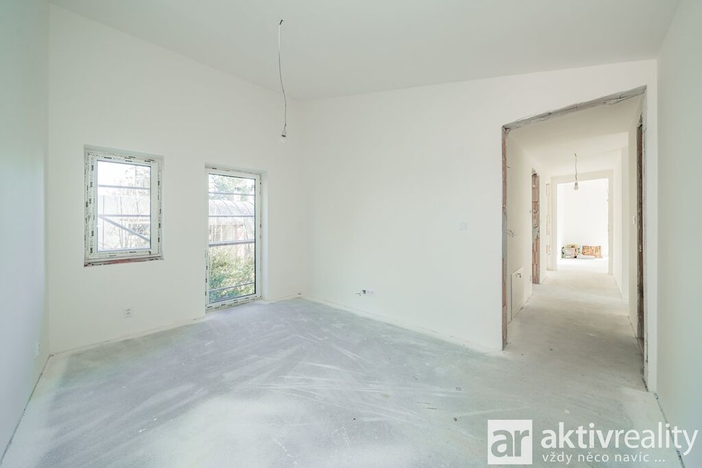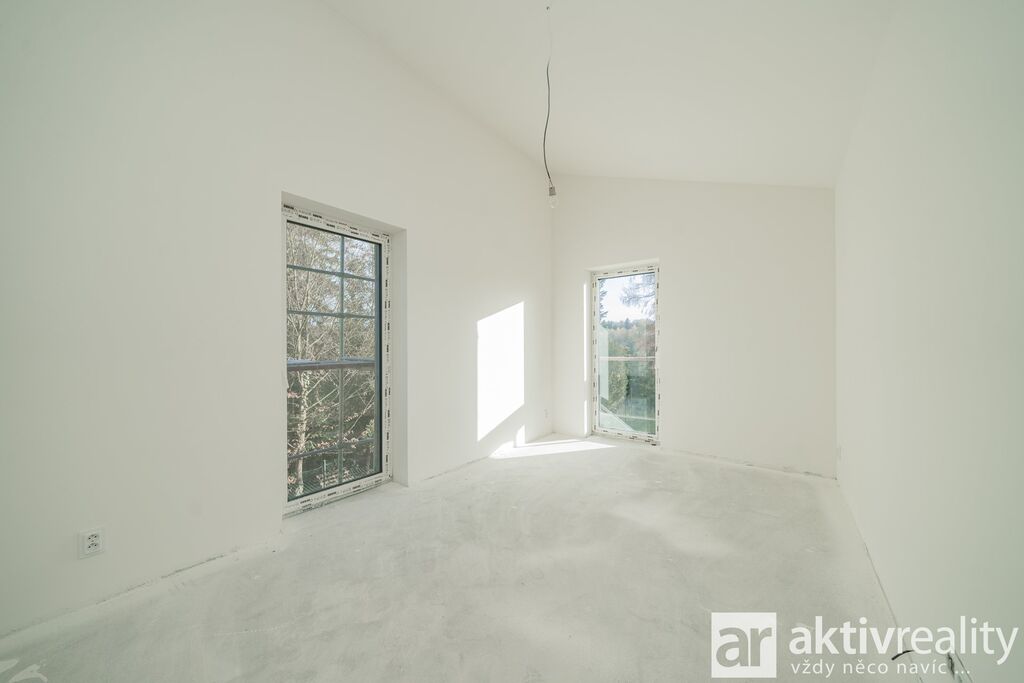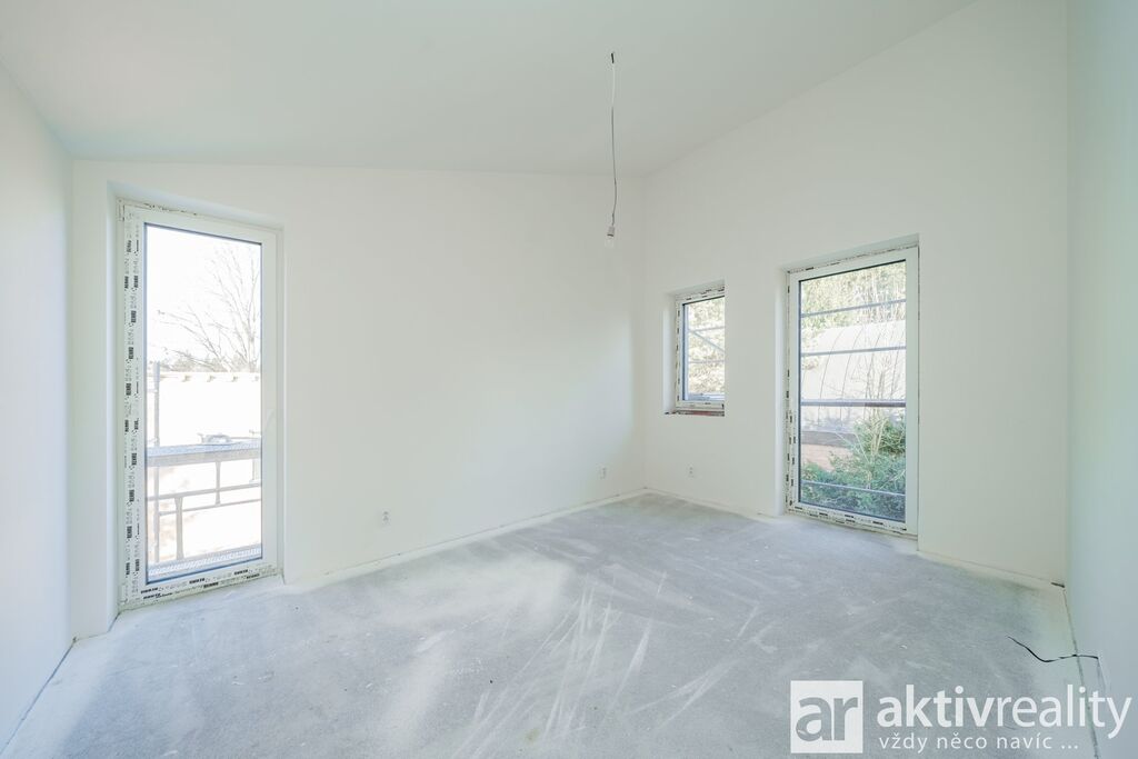Dům je vybaven moderním tepelným čerpadlem vzduch–voda napojeným na podlahové vytápění v celém domě, což zajišťuje stabilní teplotní komfort a nízké provozní náklady. Plastová okna s izolačními trojskly doplňuje venkovní stínění na elektrický pohon. Koupelny jsou řešeny v nadčasovém stylu a vybavené kvalitní sanitou Hansgrohe a Laufen. Součástí domu je také příprava na krbová kamna včetně komínu, což budoucím majitelům umožňuje doplnit interiér o další prvek tepelné pohody. Podlahy v domě byly zvoleny s důrazem na kvalitu i estetiku – celé přízemí je provedeno ve velkoformátové dlažbě 120×120 cm v dekoru mramoru, která dodává prostoru moderní vzhled a je zároveň praktická pro rodinný provoz. Schodiště a celé horní podlaží jsou osazeny vinylovou podlahou v dekoru přírodního dubu, která přináší příjemně teplý charakter a vizuální kontinuitu interiéru.