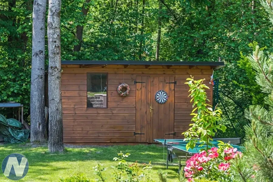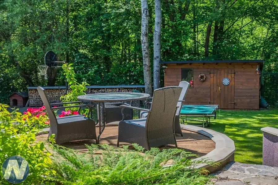 Pod domem je prostorná dvojgaráž s vraty na elektrický pohon a dostatkem skladovacích prostor pro sportovní vybavení. Za domem stojí dřevěný zahradní domek, jež slouží pro uložení zahradního nábytku a grilovacího náčiní.