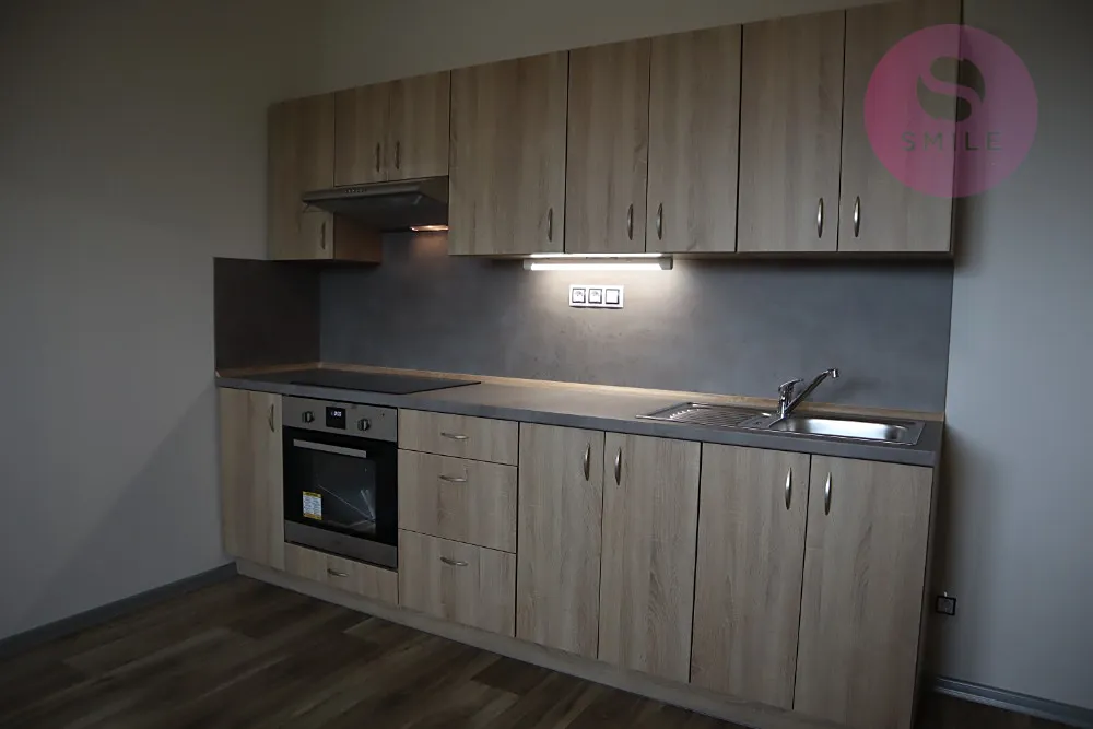 Byt se skládá z obývacího pokoje s kuchyňským koutem (kuchyňská linka s vestavěnou el. troubou, sklokeramickou varnou deskou a digestoří) a dalších místností: předsíň, koupelna s WC, sklep.