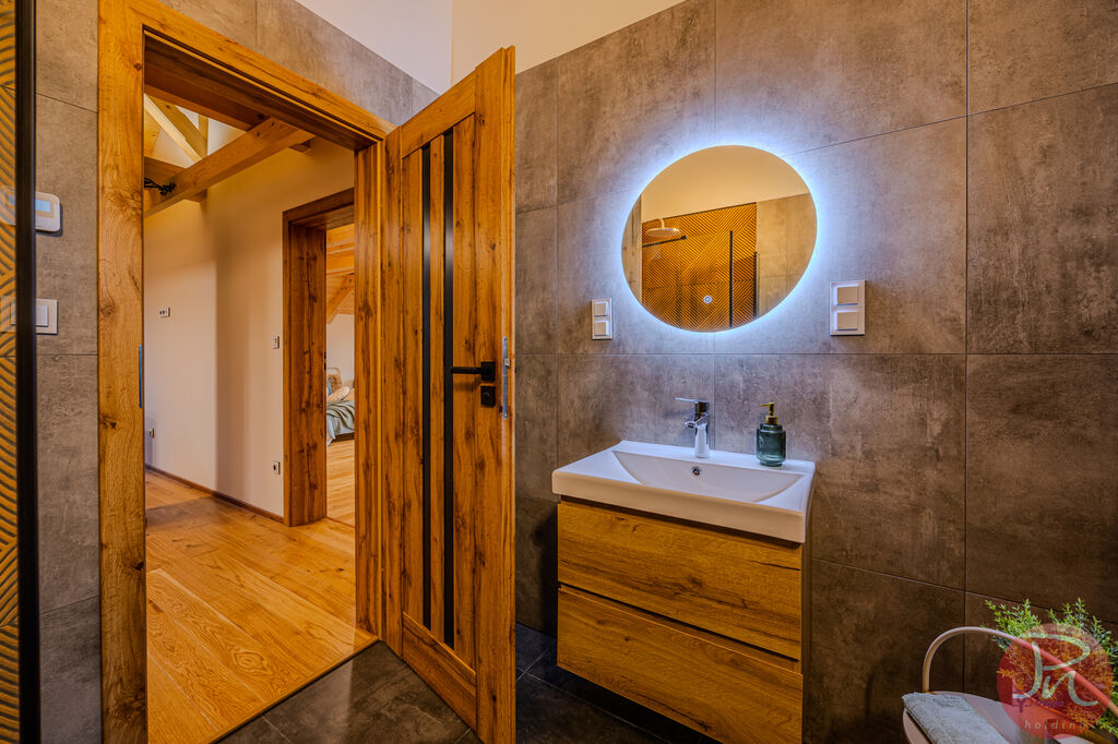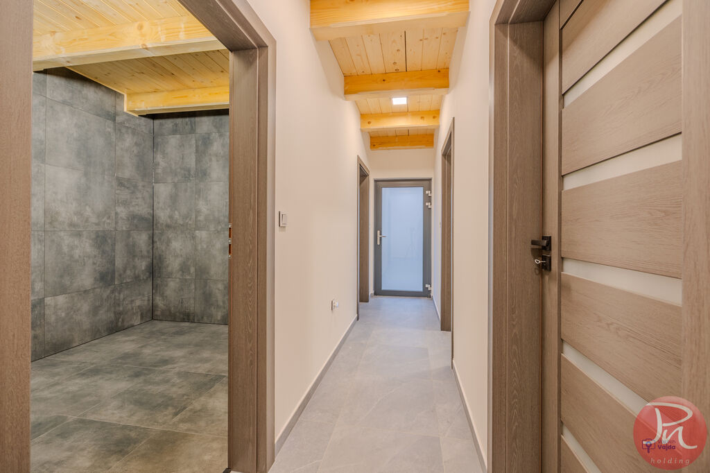 Dům je rozvržený tak, že přízemí nabízí nejen hlavní obytnou část, ale i ložnici, koupelnu, samostatné WC a místo, které z fotek jen tak nepochopíte — plnohodnotné wellness. Sauna, pokoj s vířivkou, po dohodě s majitelem. Všechno propojené s venkovním prostorem, který už jen čeká na trávník, gril a vaše rituály.