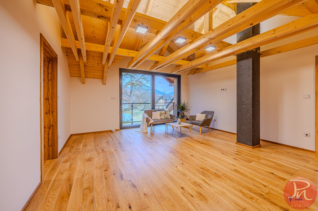 Interiér je sladěný do teplých tónů masivních stropních trámů a moderního vybavení. Denní zóna je jedna velká otevřená scéna, kterou vyplní ranní světlo přes velké prosklené plochy. Kuchyně působí jako kombinace designu a praktičnosti, od ostrůvku až po vestavné spotřebiče. Je to prostor, kde si sednete k snídani, podíváte se ven a uvidíte kopce. Doslova.