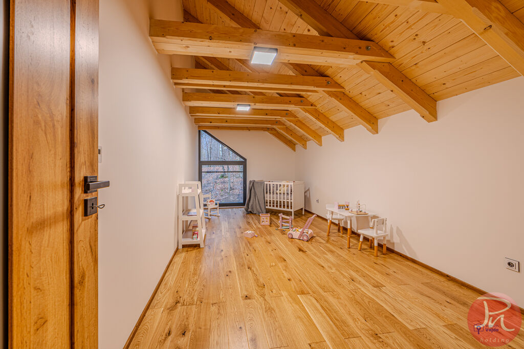 V patře na vás čekají tři samostatné ložnice, koupelna a obrovský společenský prostor, který můžete upravit podle toho, co ve vašem životě zrovna roste — rodina, přátelé, práce nebo klid. Je tu místo pro všechno.