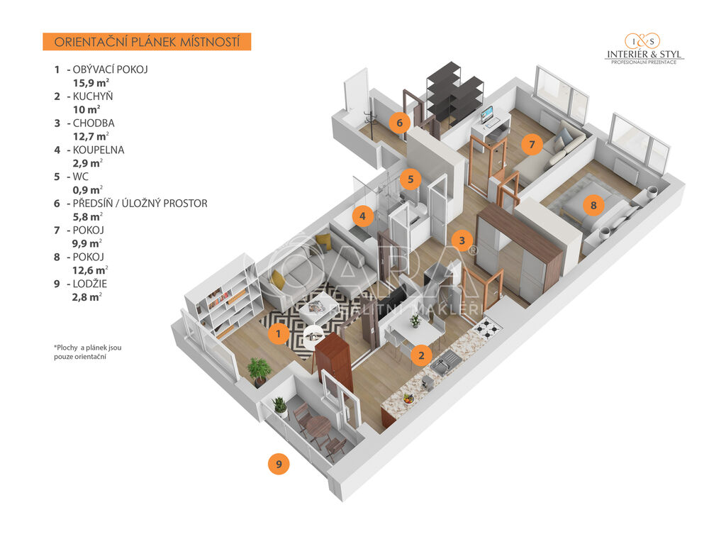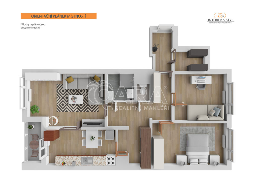 Orientace: Kuchyň a obývací pokoj jsou orientovány na jih, dvě ložnice na sever. Okna jsou plastová.