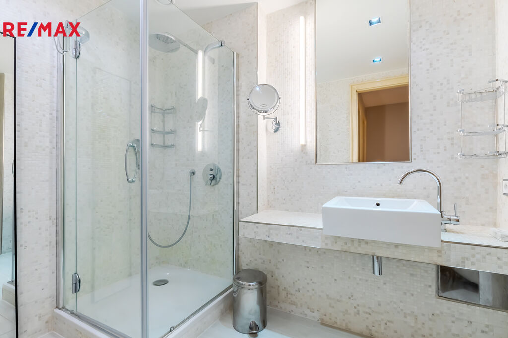 moderní kuchyňská linka se spotřebiči (indukce, trouba, mikrovlnná trouba, myčka, lednice s mrazákem), sušička, pračka. V bytě jsou dvě pohovky, konferenční stolek a další nábytek, který je součástí bytu, ale po dohodě může být odstraněn dle preferencí nájemníka.