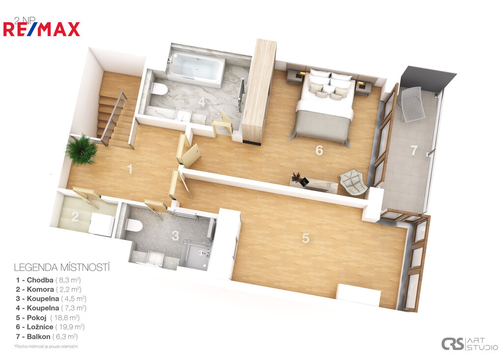 Dispozice bytu: (výměry jednotlivých částí bytu jsou přehledně uvedeny na 3D půdorysech)