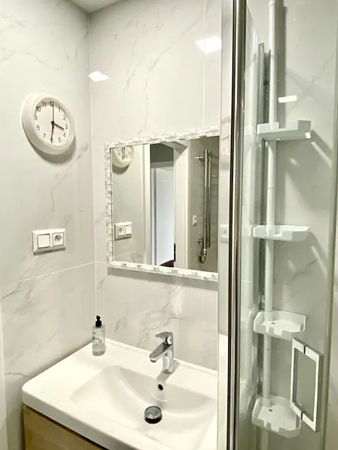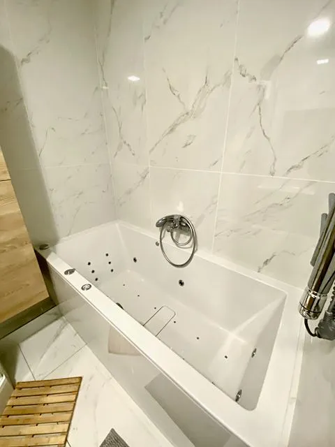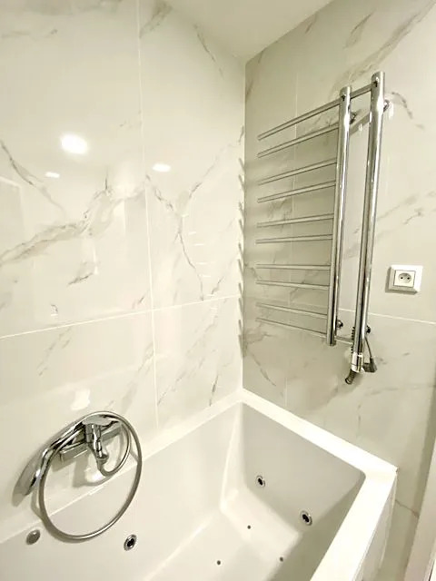 Z prostorné chodby je ještě vstup do koupelny 1,7 x 2,1 m (3,6 m2) s masážní vanou, sprchovým koutem, umývadlem se spodní skřínkou, zrcadlem a závěsnou skřínkou. Vedle koupelny je umístěna toaleta 1,7 x 0,9 m (1,5 m2) s umývadlem se spodní skřínkou a zrcadlem. V chodbě se nachází prostorná vestavěná skříň se zrcadlem, komoda a další vestavěná skříň, kde je umístěna pračka a sušička.