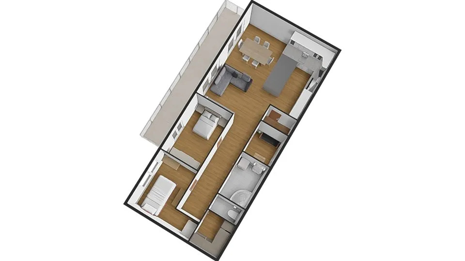 Bytová jednotka je o dispozici 3+kk, ale bez problému vzhledem k velikosti hlavní obytné místnosti je možné tuto místnost rozdělit na kuchyni s jídelnou a obývací pokoj zvlášť na dispozici 3+1 nebo pokud nebude někomu vadit menší obývací pokoj i na dispozici 4+kk. Součástí prodeje je byt s velkou terasou, komora nahrazující sklepní kóji a jedno venkovní parkovací stání. Bytová jednotka se nachází ve třetím patře cihlového bytového domu s výtahem, který pochází cca z roku 2010.
