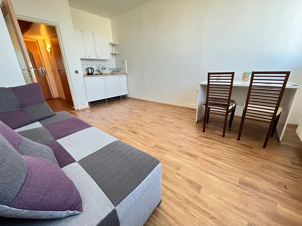 Vstupními dveřmi vcházíme do chodby (cca 2,80 m2), která je vybavena vestavěnými skříněmi, lednicí a vstupy do koupelny s WC a pokoje s kuchyňským koutem. Po levé straně se nachází koupelna s toaletou o velikosti cca 2,30 m2, která disponuje toaletou, sprchovým koutem, umyvadlem a koupelnovou skříňkou. Hlavní dominantou bytu je pokoj s kuchyňským koutem o výměře cca 15 m2, ve kterém se nachází menší kuchyňská linka s elektrickým sporákem s troubou a přípojkou na pračku. Tento pokoj se dále nabízí bez vybavení a je orientovaný na východ.