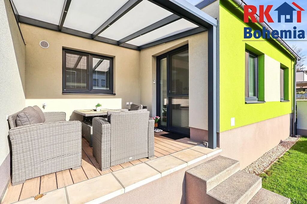 Prostorný obývací pokoj je přímo propojen s terasou a přilehlou zahrádkou, které tvoří ideální útočiště pro Vaši každodenní relaxaci a odpočinek.
