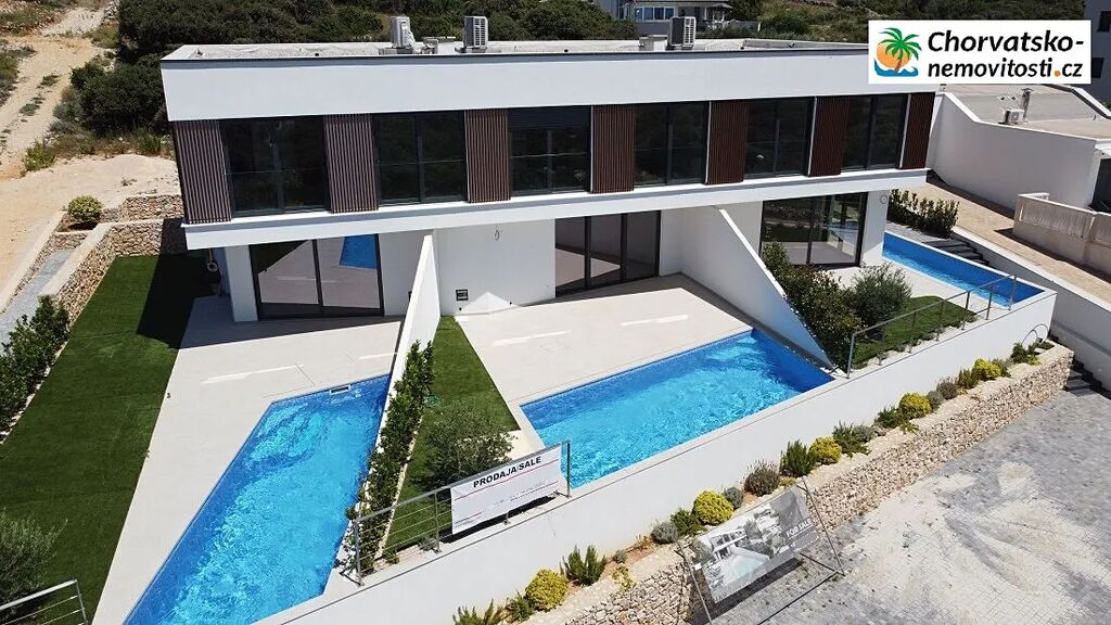 Chorvatsko-Nemovitosti.cz nabízí nový velký luxusní dům s bazénem. Dům má 3 apartmány, každý 130m2. Dvoupartové apartmány jsou částečně zařízené a s výhledem na moře. Apartmány mají různě velké zahrádky. Apartmánový dům se nachází podél přímé cesty k moři. V ceně je i parkování, pro dvě vozidla. Velice pěkná výbava, která je laděna do světlých mořských barev. Zeleň kolem domu nabízí příjemný stín a poskytne Vám příjemný pobyt venku s vašimi blízkými. Nedaleko je malý supermarket a restaurace. Podrobně o domě: