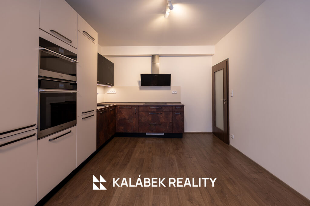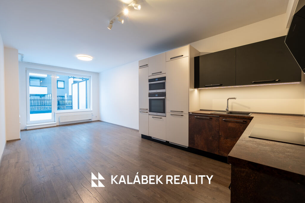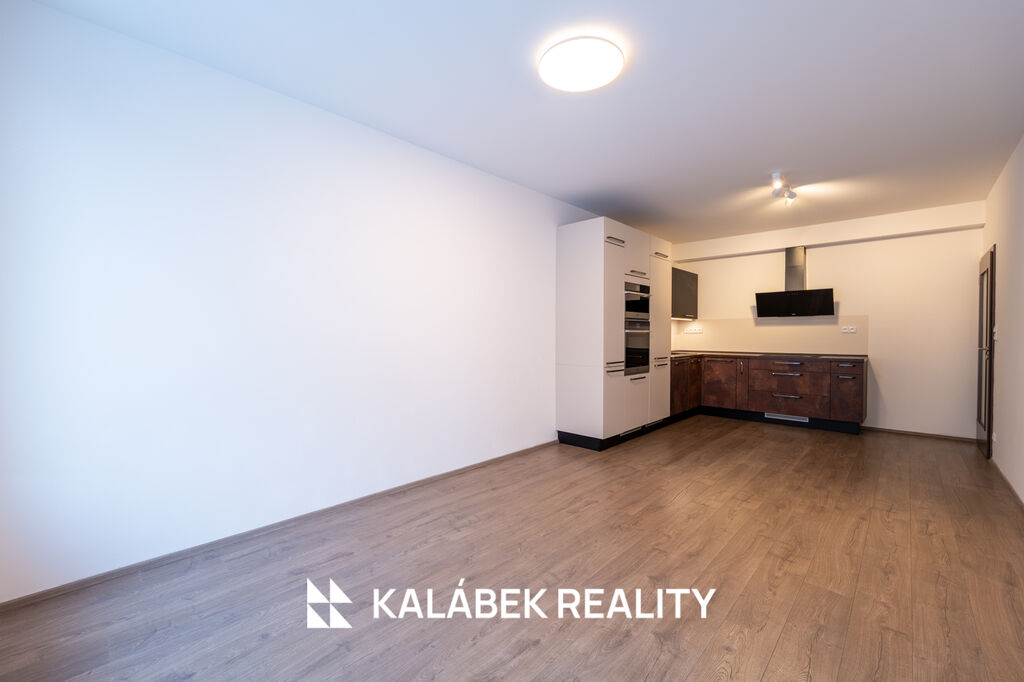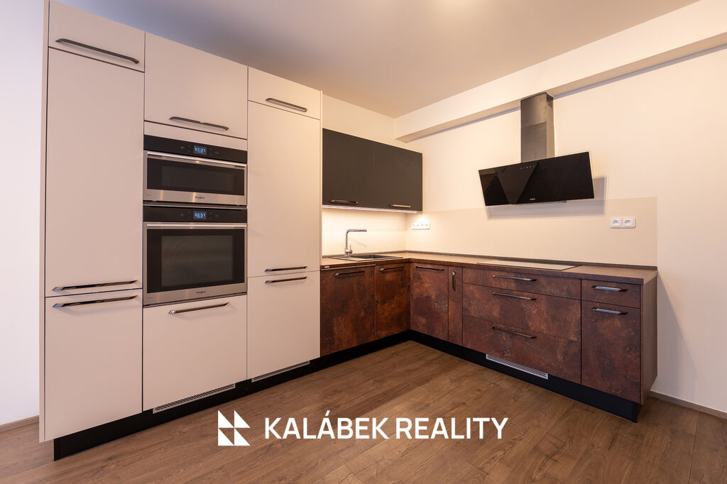 - Obývací pokoj 24,8 m² s plně vybavenou kuchyňskou linkou Oresi (indukční varná deska, trouba, mikrovlnná trouba, lednice s mrazákem, myčka)