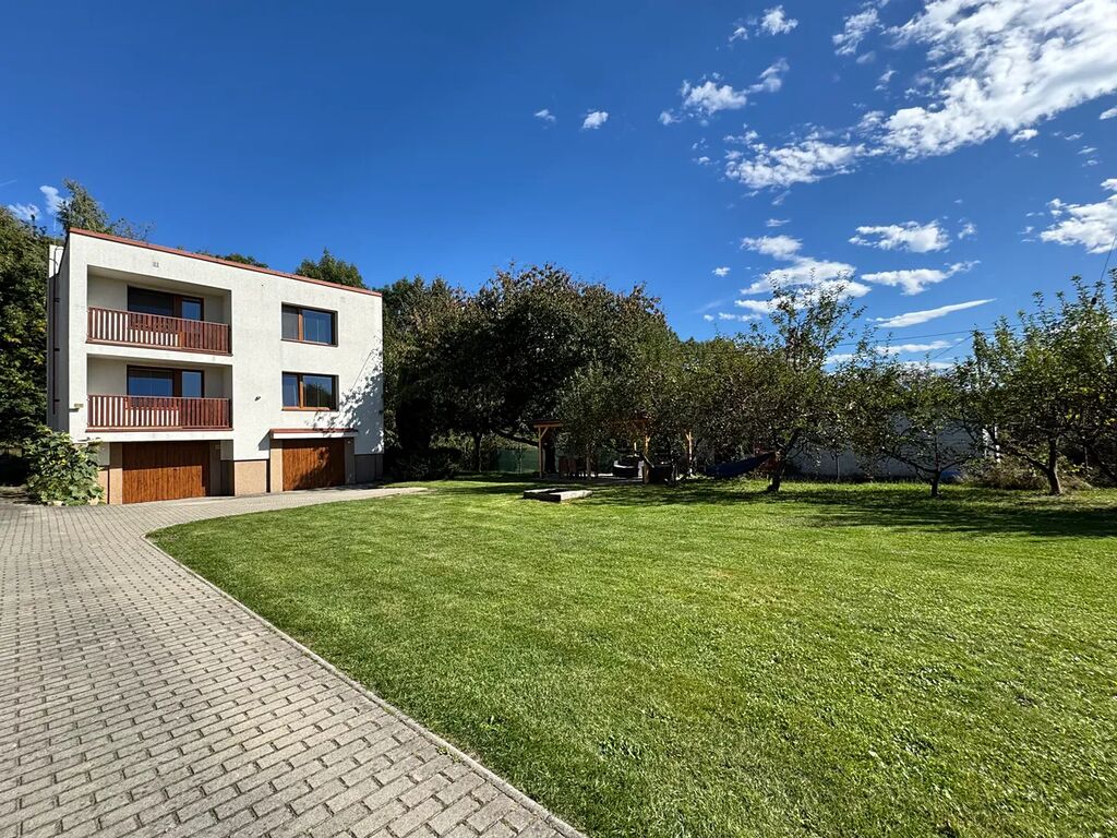 Součástí celé nemovitosti je také rozlehlá společná zahrada s bytem z druhého nadzemního podlaží, upravená, o velikosti 1233 m², najdete zde ovocné stromy, keře, pergolu, dětskou zónu, ale i další místa na parkování aut pro hosty.