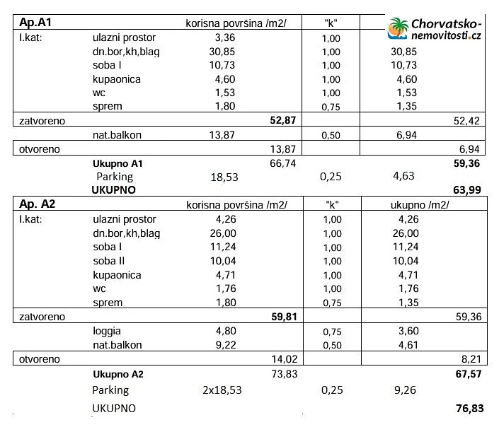 Na prodej třípokojový byt (A2) o celkové ploše 76,83 m2 v prvním patře novostavby v Novalji
